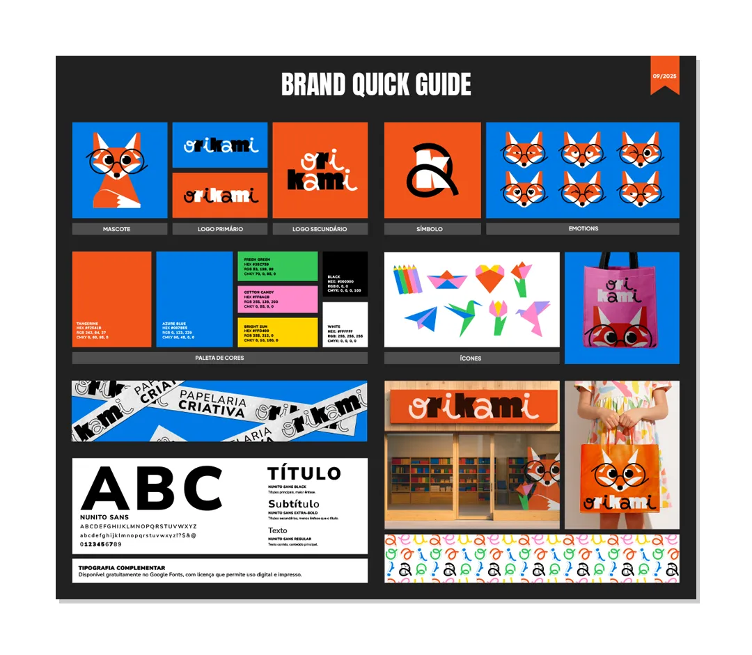 A identidade visual nasce do conceito “Criar é dobrar a imaginação”, explorando o contraste entre estrutura e liberdade. O logotipo combina formas firmes com dobras sutis, evocando o gesto de moldar o papel, enquanto as intervenções manuais trazem o toque espontâneo e humano da criação artística.