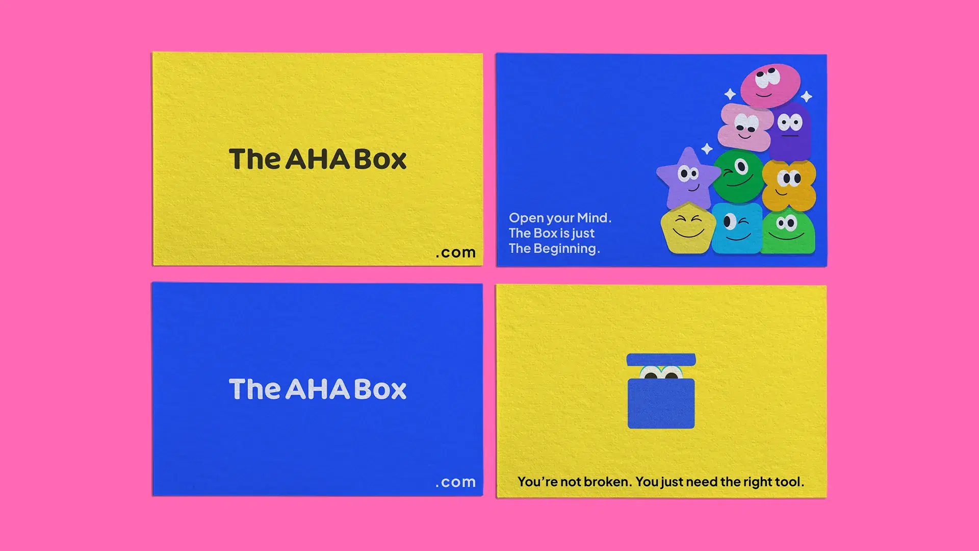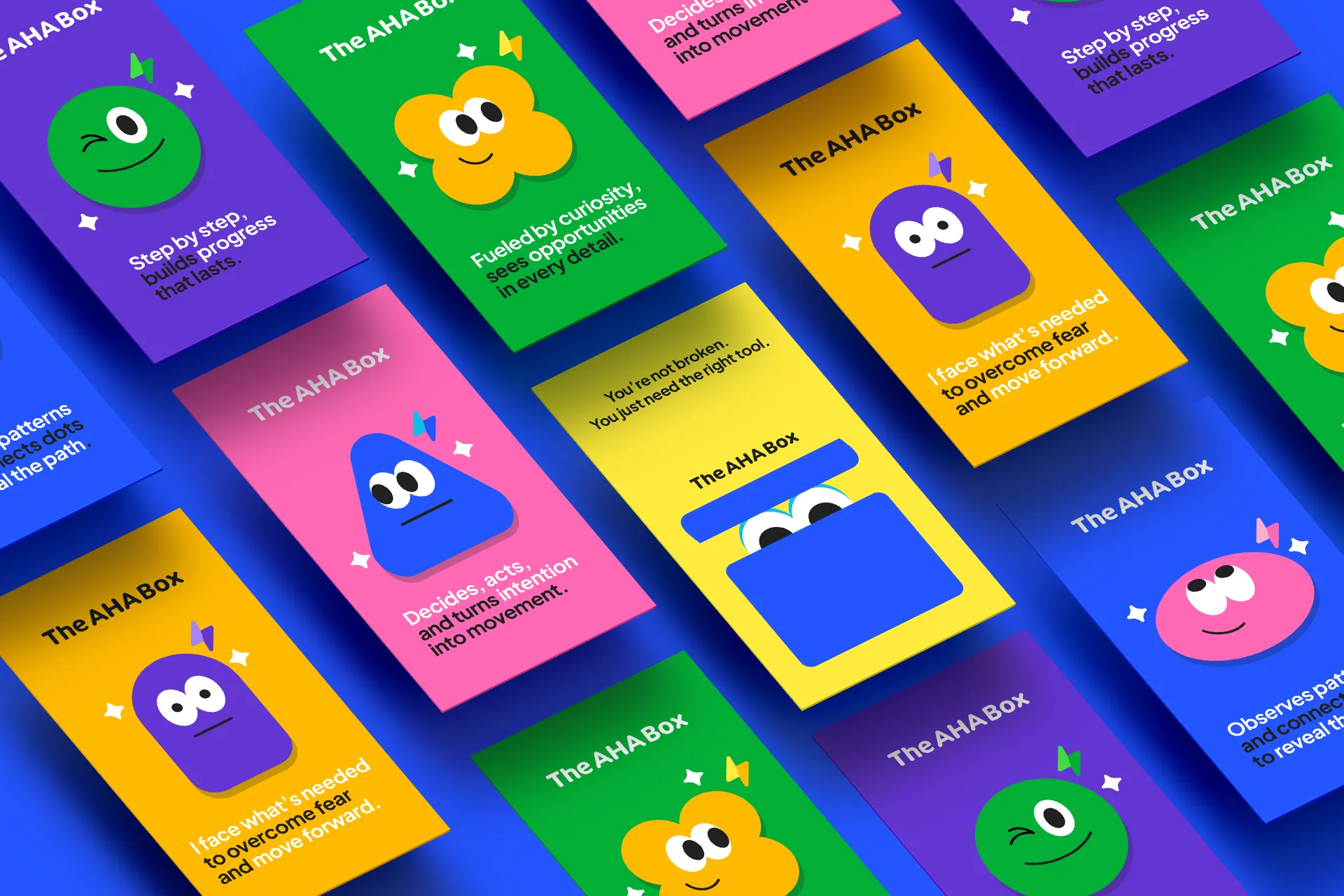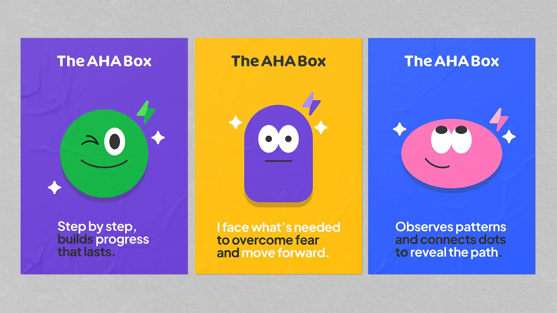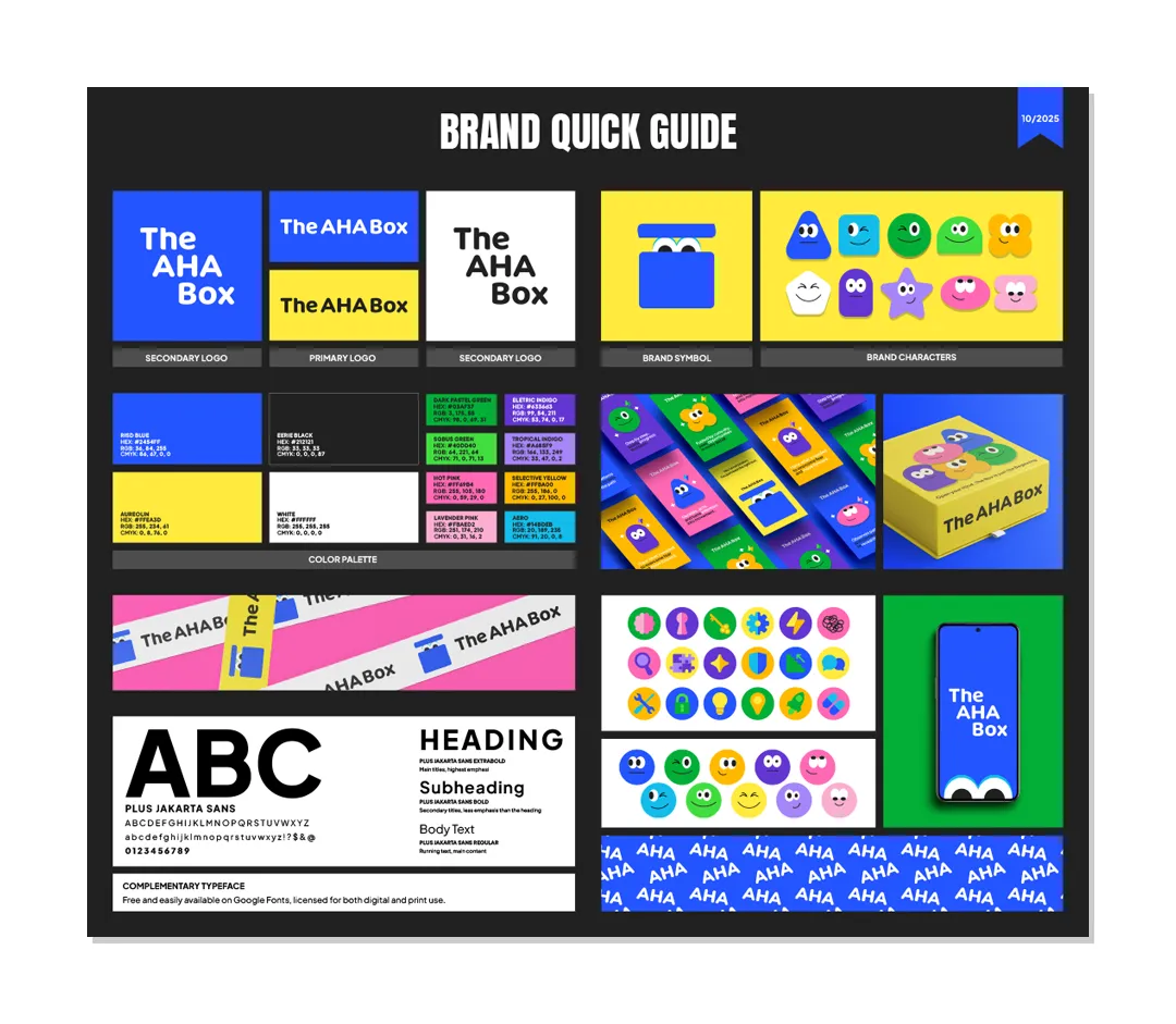 O resultado é uma identidade que une razão e emoção, estrutura e leveza — um sistema visual que não apenas comunica, mas inspira ação. The AHA Box se posiciona como uma ferramenta inteligente e humana, feita para desbloquear o pensamento e impulsionar o movimento com clareza e confiança.